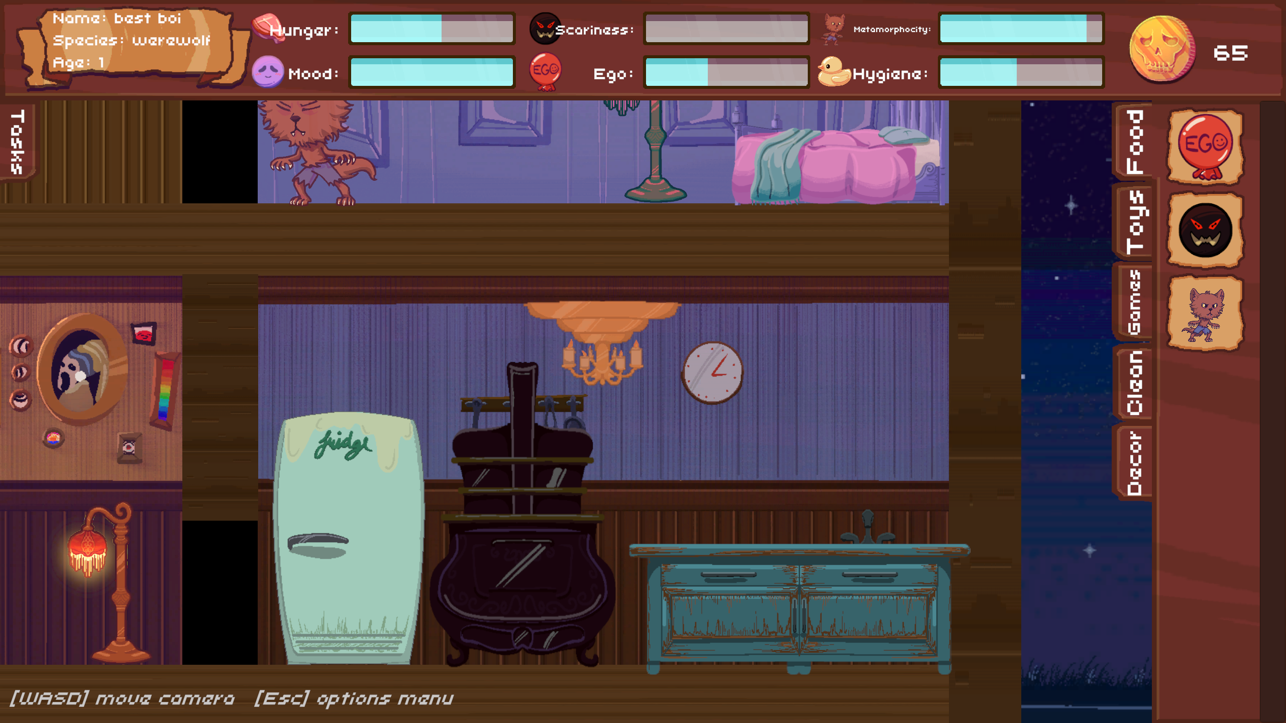 Adopt and raise one out of three different monsters. Feed, groom, play and choose how you respond to their actions to make sure they grow up ready to scare the world. Each monster has a favourite food, disliked food and a unique minigame, making up to 5 different minigames to be played. Decorate the house with a variety of furniture by spending coins earned from minigames.